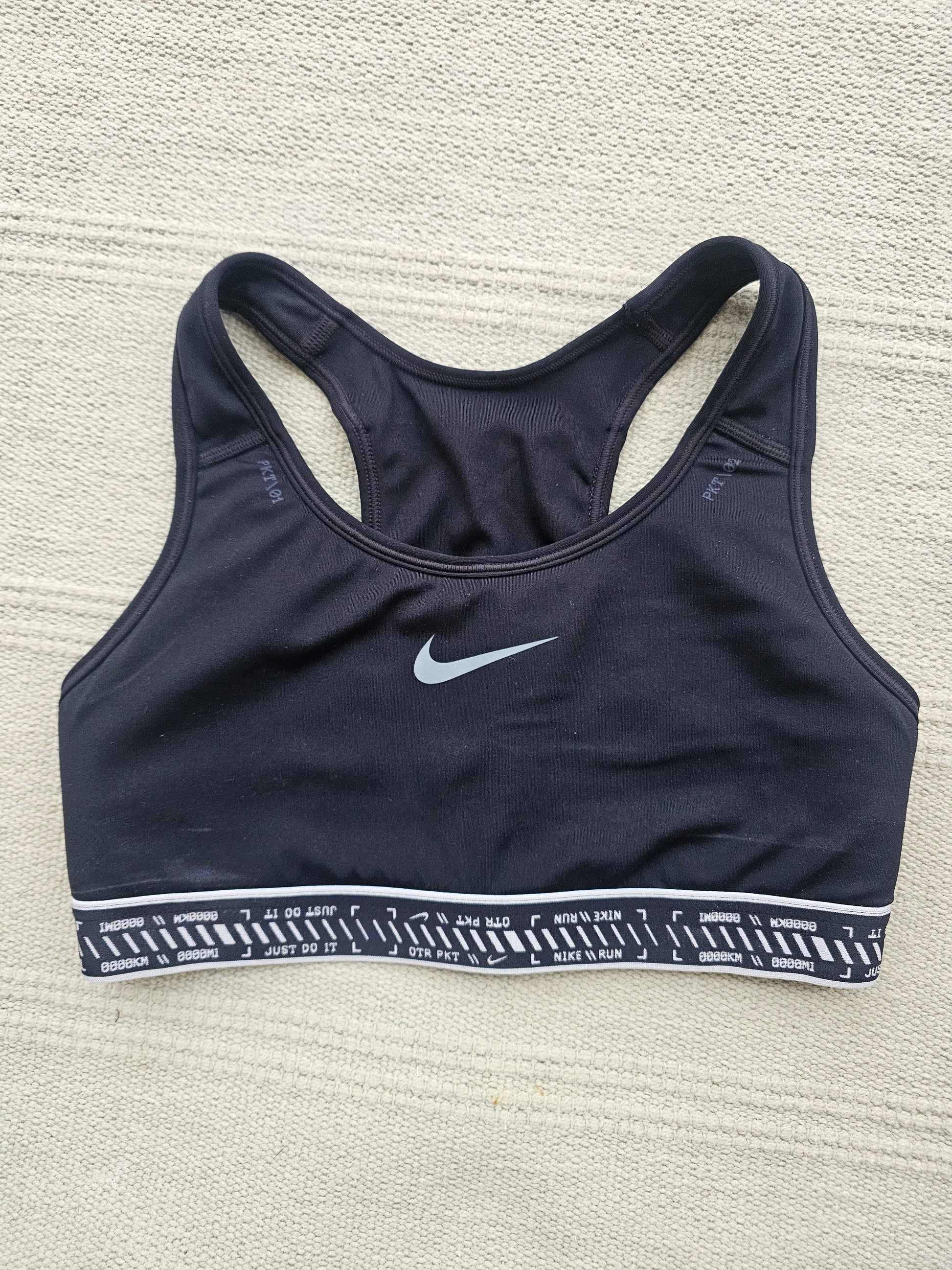 Cette brassière Nike Dri-FIT, dotée de bretelles dos nageur et d’une large bande élastique "JUST DO IT", est idéale pour l’entraînement intense et la course à pied.