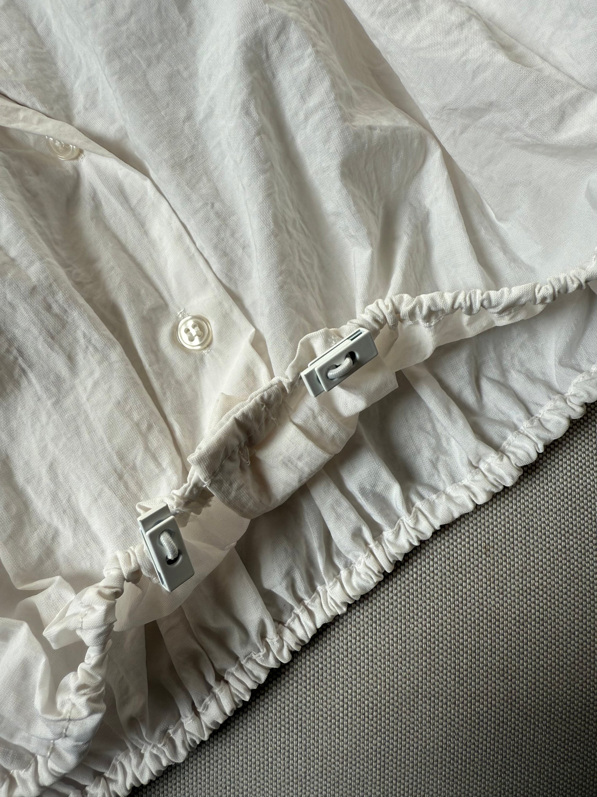 La chemise blanche classique, mais twistée en version crop ! Légèrement courte, elle se resserre à la taille grâce à son élastique, créant naturellement un effet retourné ultra flatteur.