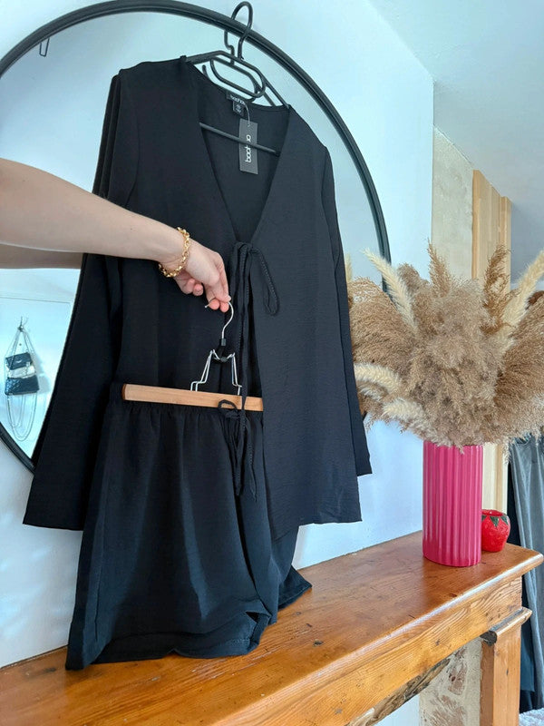 💬 On aime : le haut à nouer ultra flatteur et les manches évasées, associés à un short fluide taille élastique pour un confort absolu.